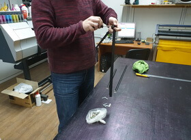 Затем из металлического профиля мы изготавливаем рамку, тыльную сторону которой закрывает прямоугольный белый фон. Распечатанный на плёнке портрет мы приклеиваем к вспененной основе для придания необходимого объёма и жесткости.
