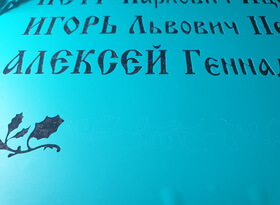 Саму гравировку мы выполнили при помощи пескоструйного аппарата и сразу же принялись за покрытие текста сусальным золотом. Начали с орнамента, так как работать с элементами декора проще, чем с печатным текстом.
